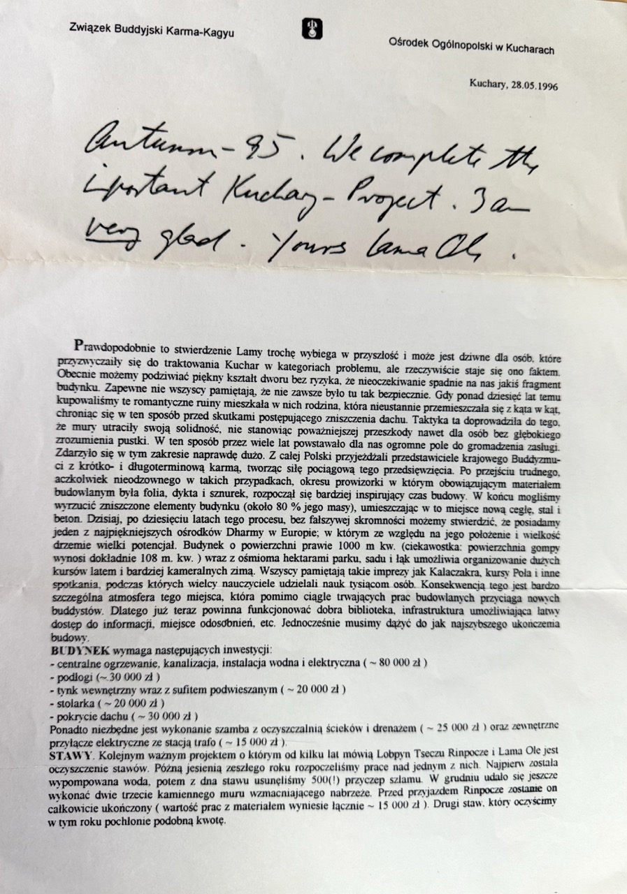 W 1996 roku Kuchary otrzymały taki oto, odręczenie napisany list od Lamy Ole: