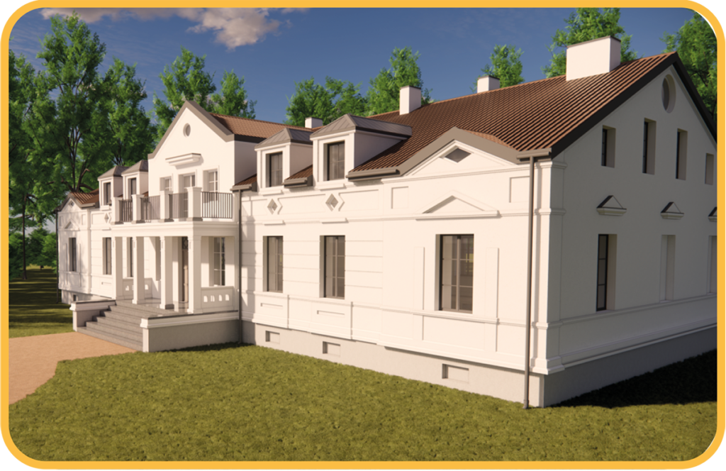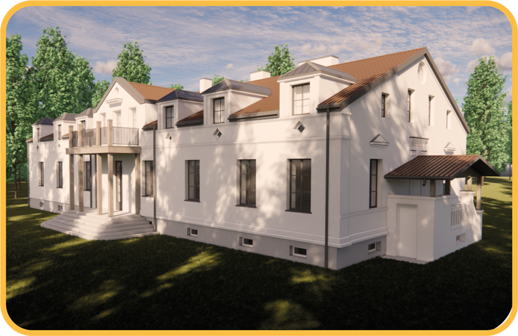 • wszystkie okna połaciowe zostaną zamienione na typowe dla dworków okna pionowe osadzone w lukarnach. W centralnej części budynku, od strony parku, powstanie większy pokój z balkonem. Efektem tych zmian będzie: powiększenie kubatury pomieszczeń, ułatwienie dostępu do okien oraz możliwość zainstalowania moskitier,